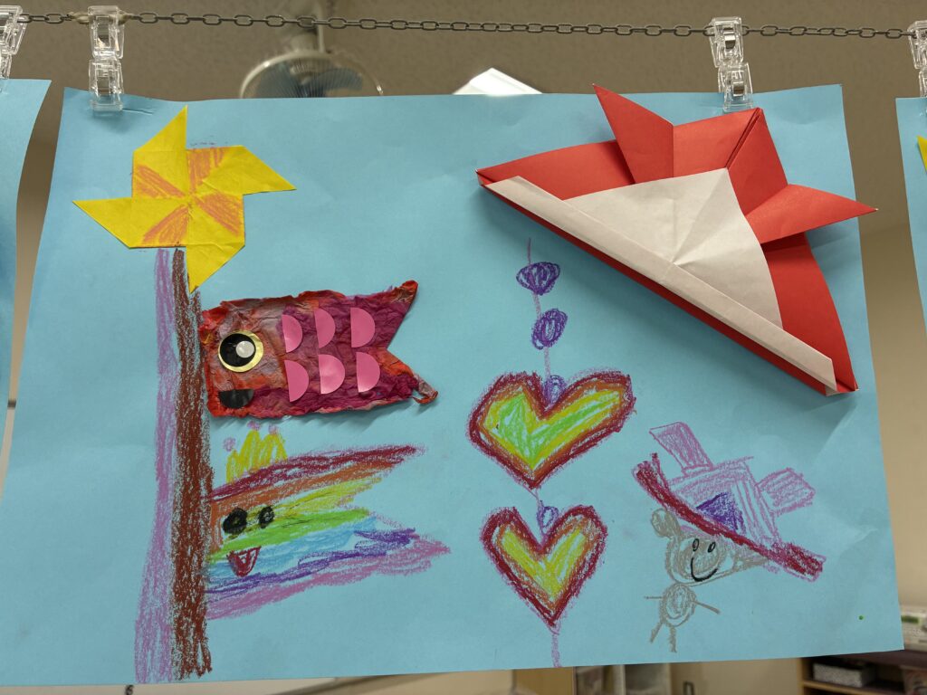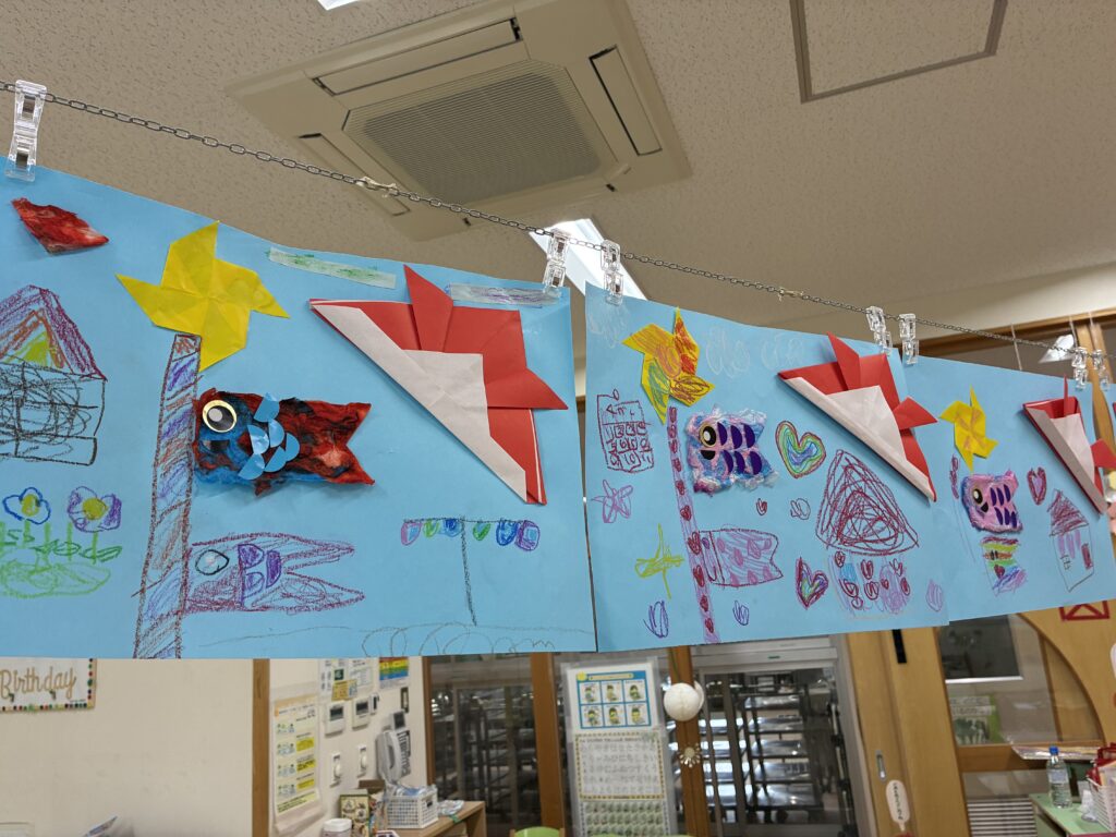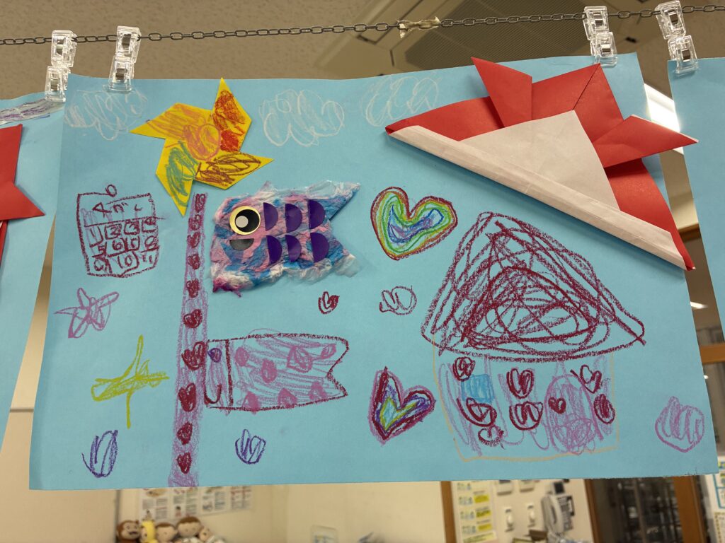 風車、兜も折り紙で作り、クレヨンで好きな絵も描き、素敵な作品になりました。