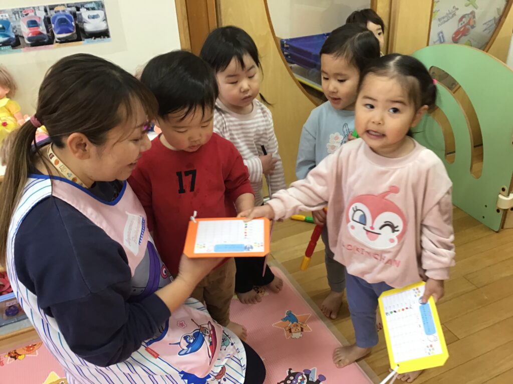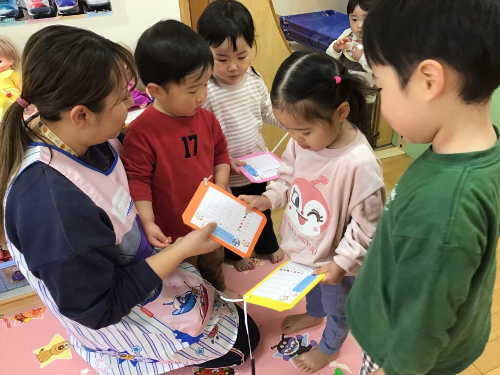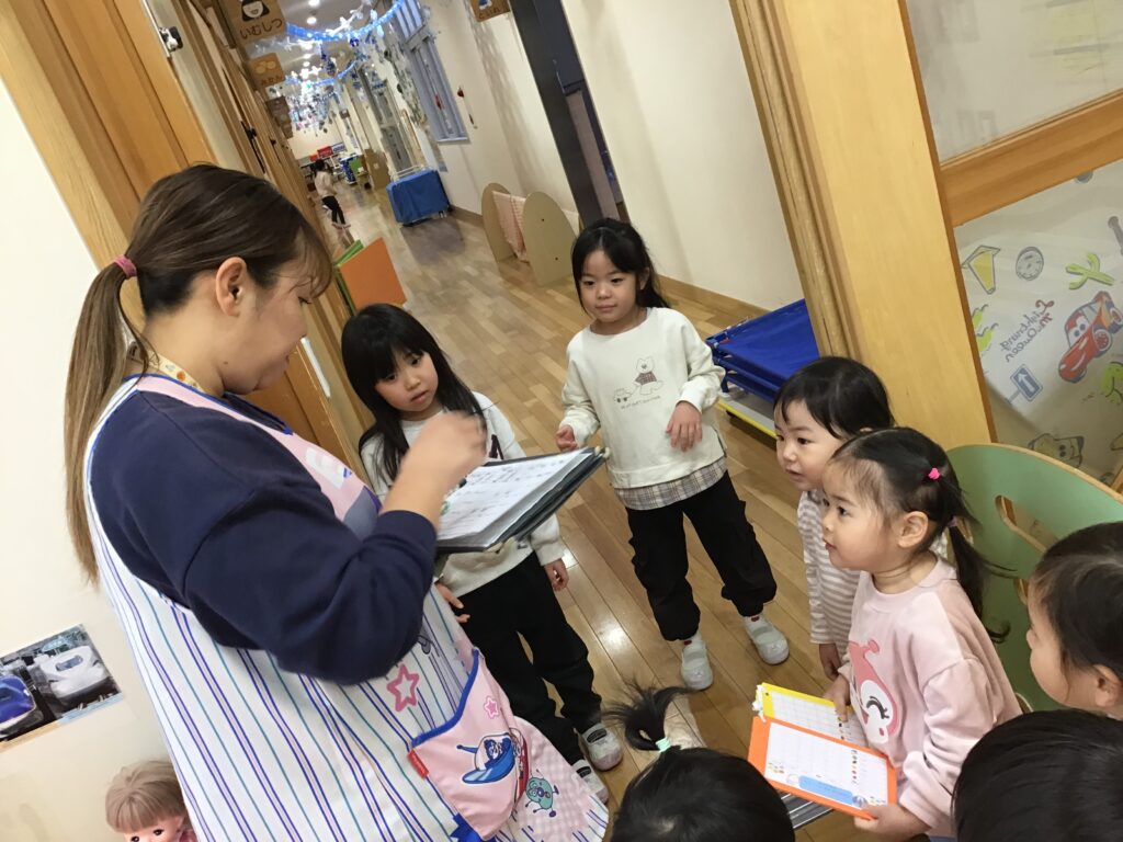 5歳児クラスめろん組のお友だちがが、お当番活動をしています。朝は、各クラスの人数を確認する人数当番。クラスを回り、担任の先生に人数を書いてもらうお仕事です。毎日、それを見ていた1歳児クラスいちご組の子どもたち、「にんずうとうばんやりたい!」、ということで、担任の先生が当番表を作り、人数当番にチャレンジしました。まずは、いちご組に来ためろん組のお姉さんたちの様子を見て、お当番をやってみた子どもたち。そのお顔はとても嬉しそうで、誇らしそうでした。