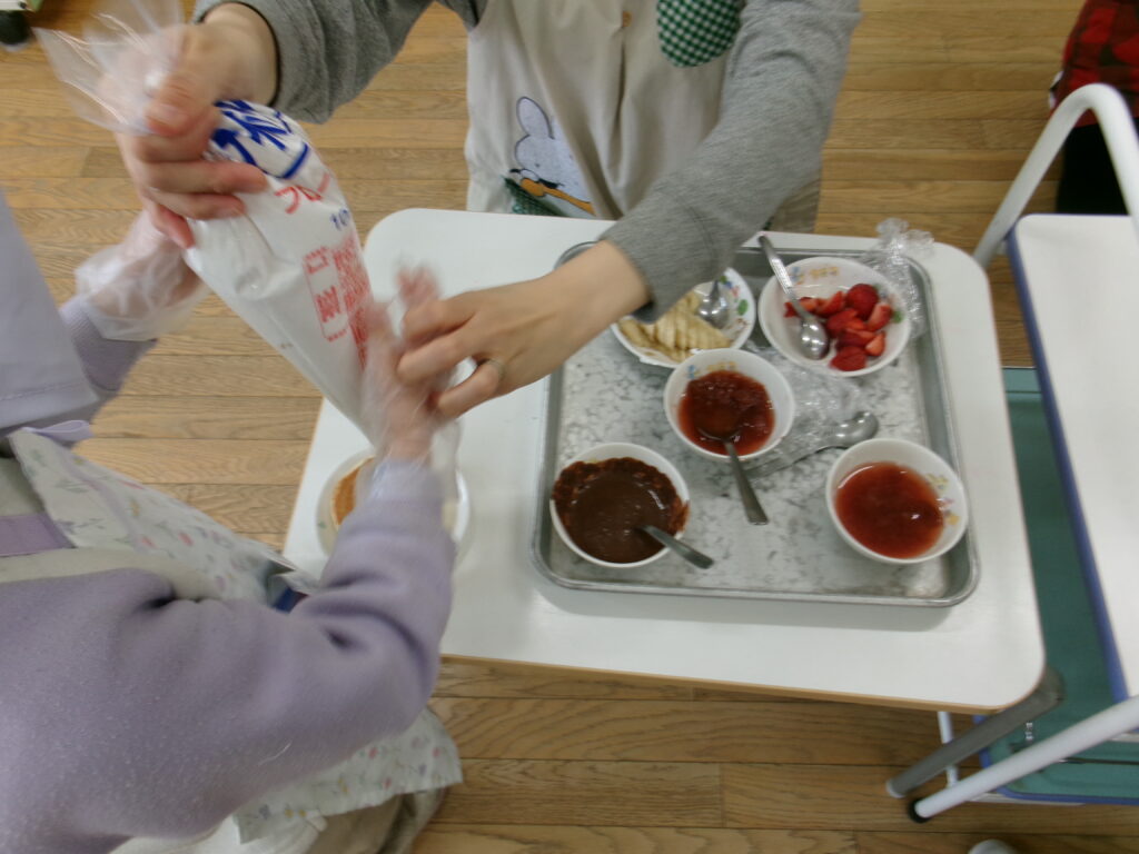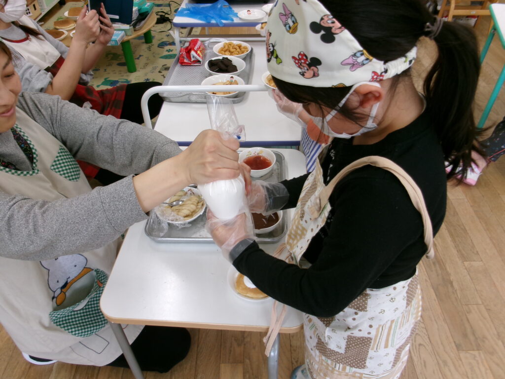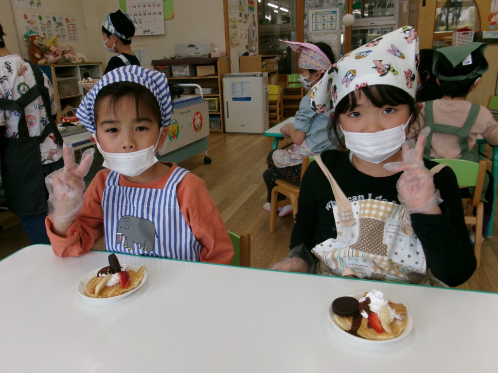 みんなの分が焼きあがった後は、お楽しみのトッピング。生クリーム、バナナ🍌イチゴ🍓ココアソース、いちごソース🍓オレオ🍪たべっ子どうぶつ、キャラメルコーンの中から、好きな物を選んでトッピングし、美味しそうなパンケーキが完成。「いただきます」、みんなで美味しくいただきました。