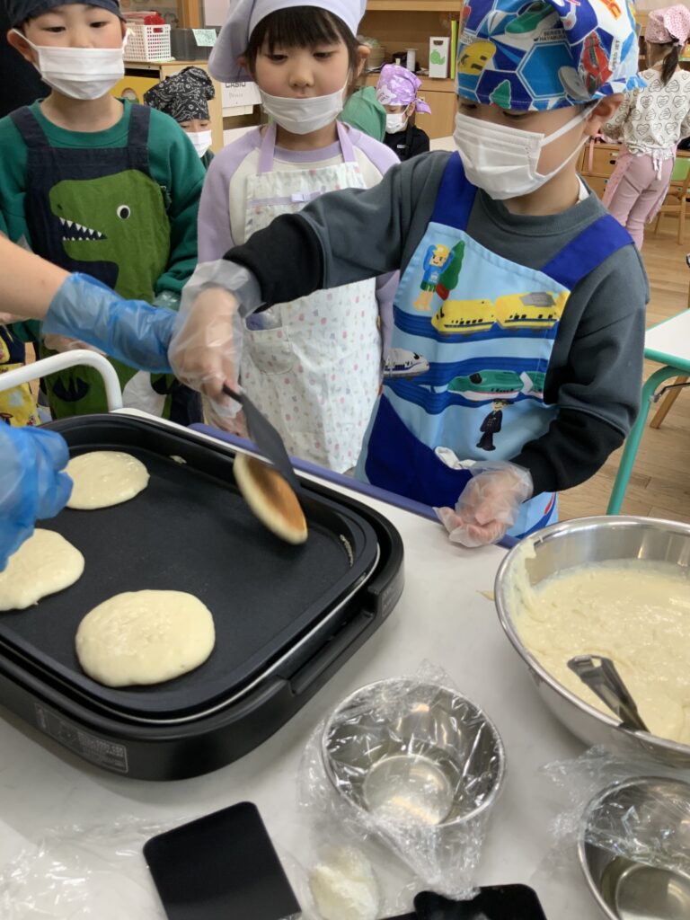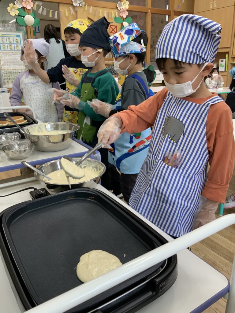 昨日、保育園最後のクッキングを楽しみました。献立はパンケーキ。お気に入りのエプロンと三角巾を付けてウキウキの子どもたち。給食の先生の説明を聞いてから、早速ホッとプレートで焼いてみました。お玉に、ホットケーキミックスをホッとプレートの上に乗せて、表面がぷつぷつしていたら、ひっくり返すのにもチャレンジ。上手くいくととっても嬉しそうにしていました。