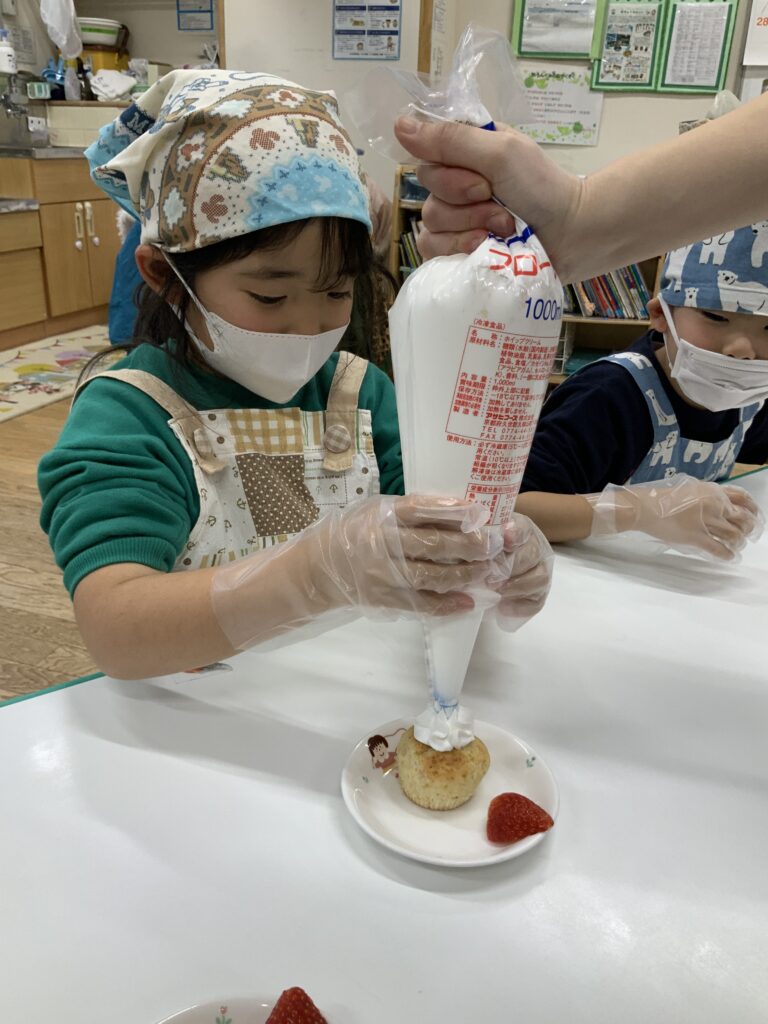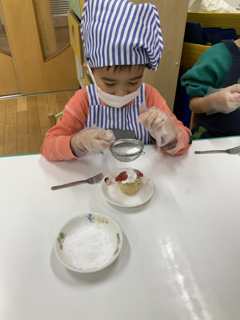 クリスマスクッキング 2025-12-24 今日のおやつはクリスマスカップケーキでした。4歳児クラスぶどう組、5歳児クラスめろん組は、クリスマスクッキングをしました🎂🎄エプロンと三角巾を付けて準備オッケー。給食の先生の説明を聞いてから、給食の先生が焼いてくれたカップケーキに、いちごと生クリームをトッピング🍓最後に雪に見立てた白い粉(粉糖)をかけて出来上がり✨「できたー」、「おいしいね」・・・とても嬉しそう。「おいしいね」、「いちごあまいね」と美味しく食べていました。