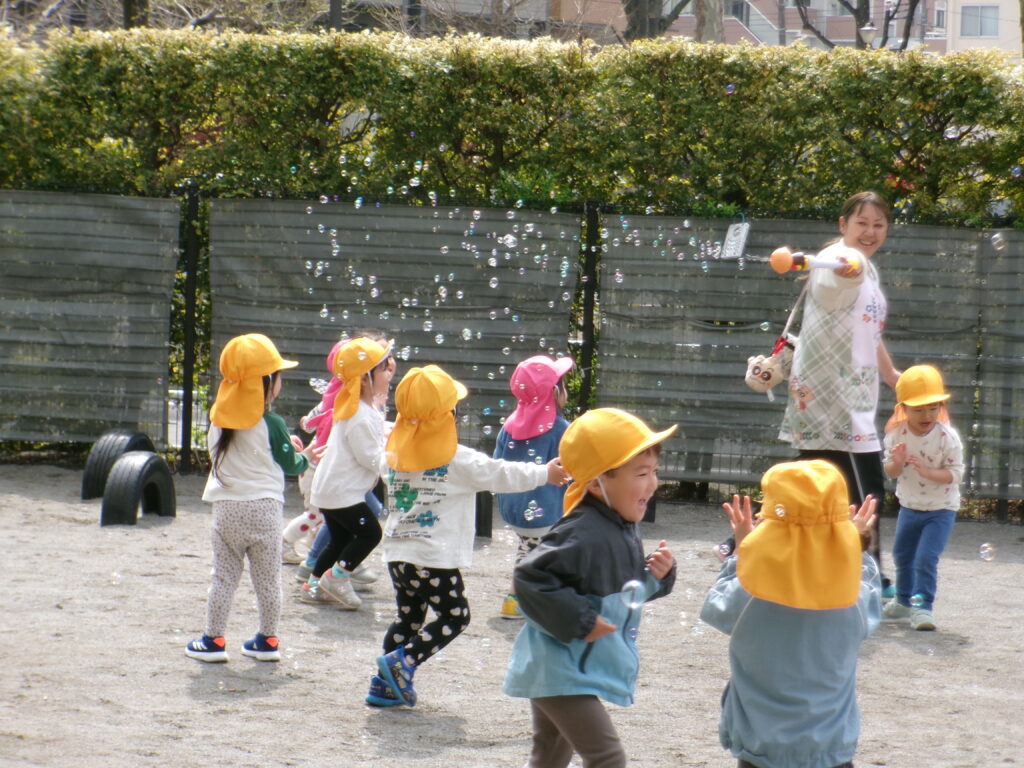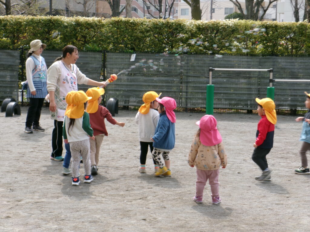 シャボン玉とんだ 2026-04-01 先生が楽しそうなおもちゃを見つけ、早速園庭で試してみると、想像以上に沢山のシャボン玉ができたので、子どもたちが集まってきて大喜び。 KODAK Digital Still Camera KODAK Digital Still Camera しゃーぼんだまとんだ、そーらーまーでーとんだ♬♪♩