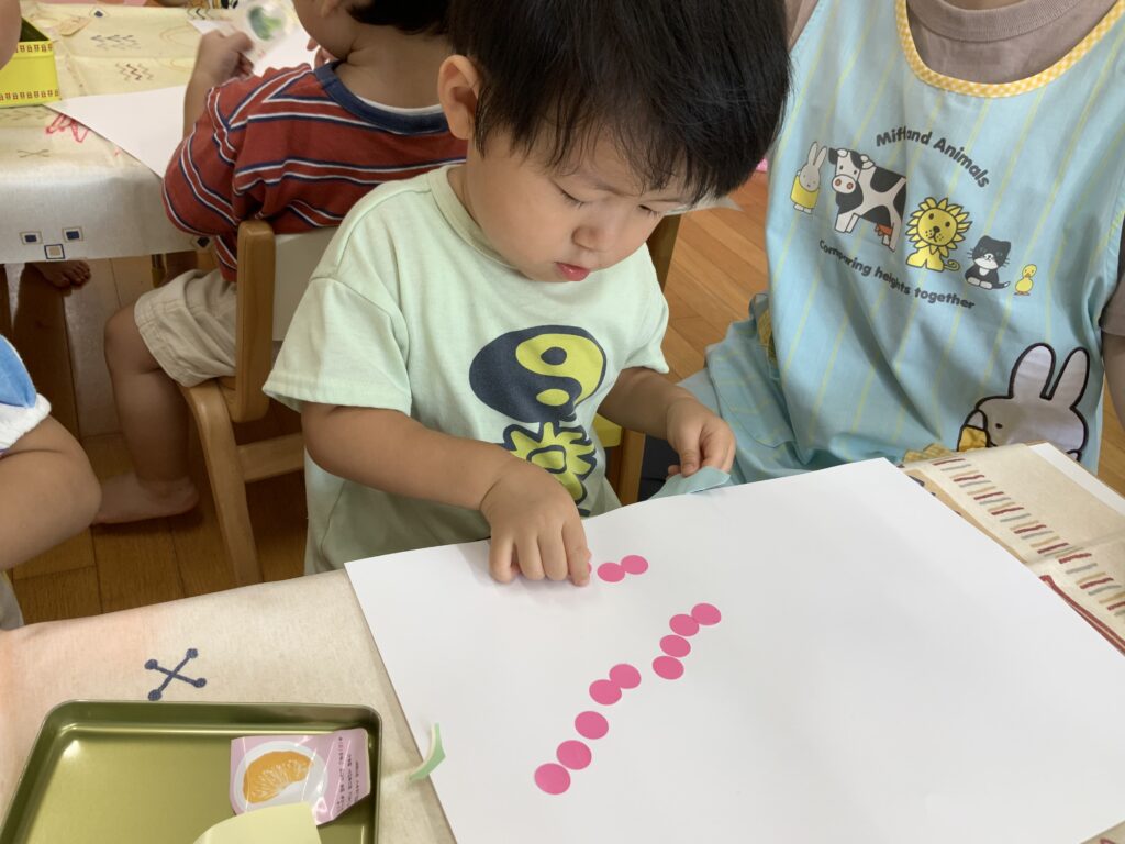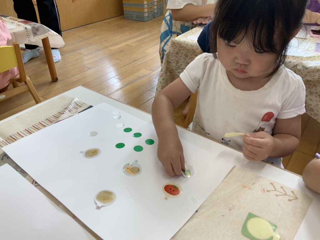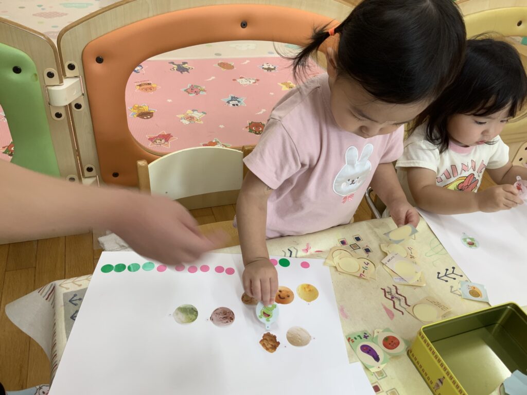 シールぺたぺた 2025-10-08 1歳児クラスいちご組🍓 色んな制作も楽しんでいます。指先の使い方も上手になってきたので、まーるいシールを貼る制作にチャレンジ✨✨色んな色や、アイスクリームの絵が付いたシールを、真剣な眼差しでぺたぺたと上手に貼っていました。