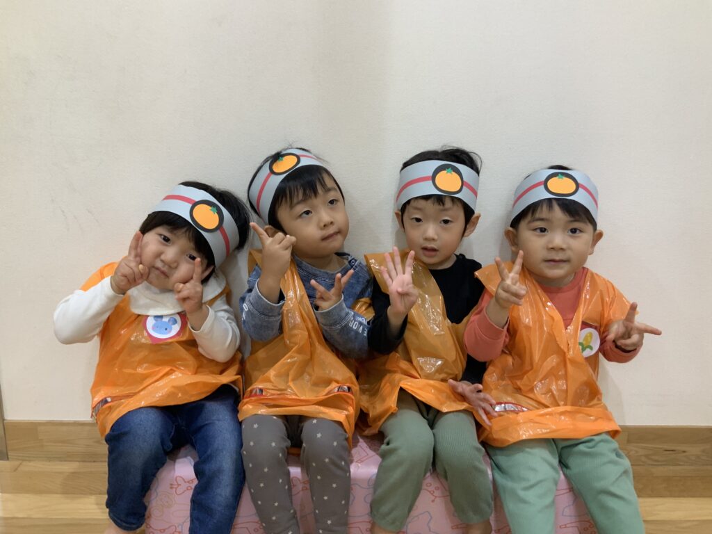 衣装を着て先生の声掛けに体を左右に動かして楽しんでいました。