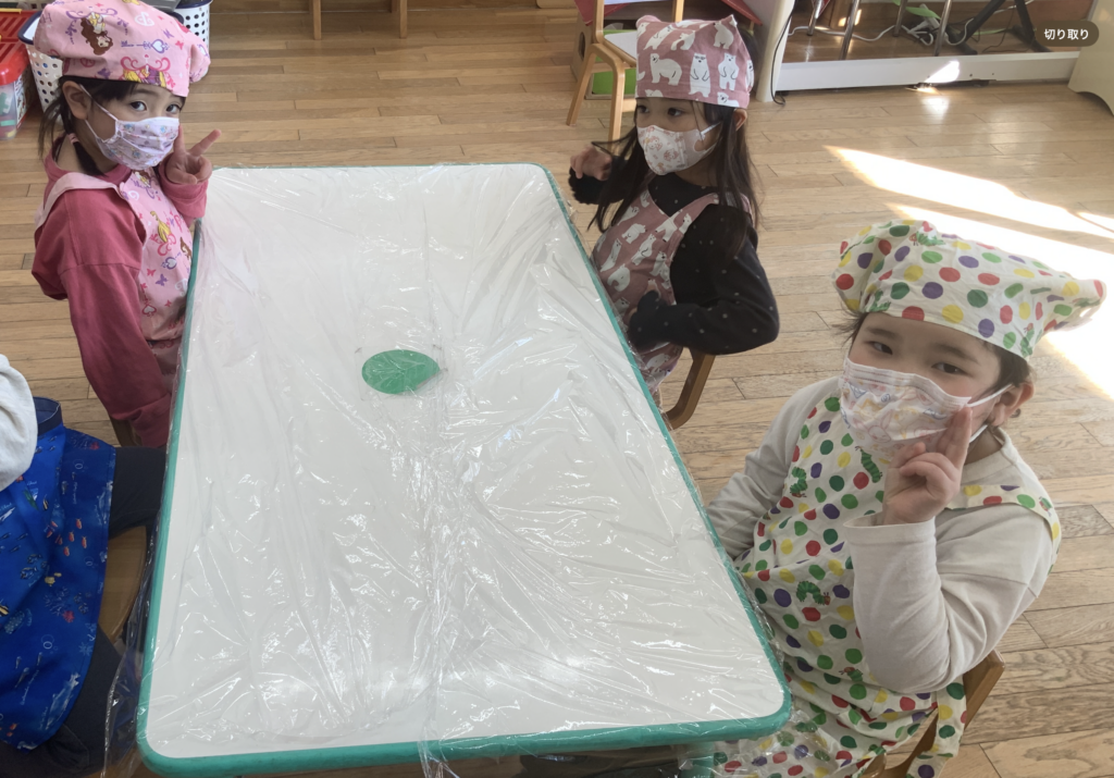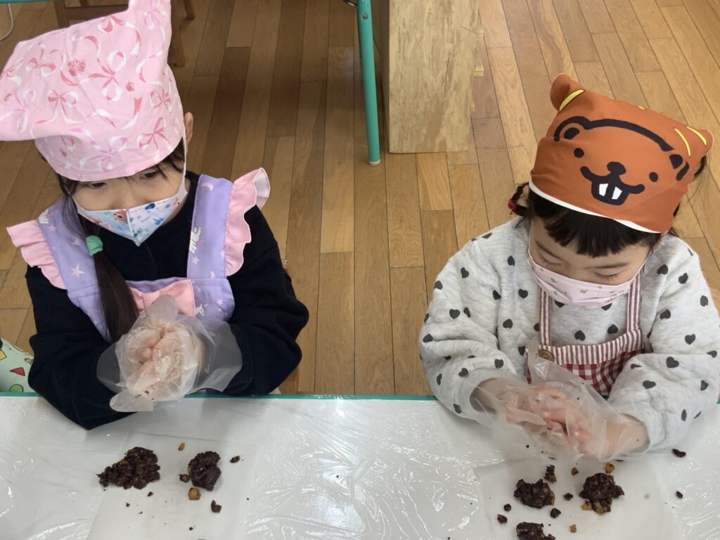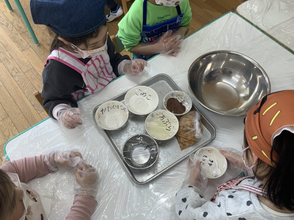 元気あふれる4歳児クラスぶどう組🍇昨日は、バレンタインクッキングとしてクッキーを作りました。お気に入りのエプロン、三角巾を付けて準備万端👌