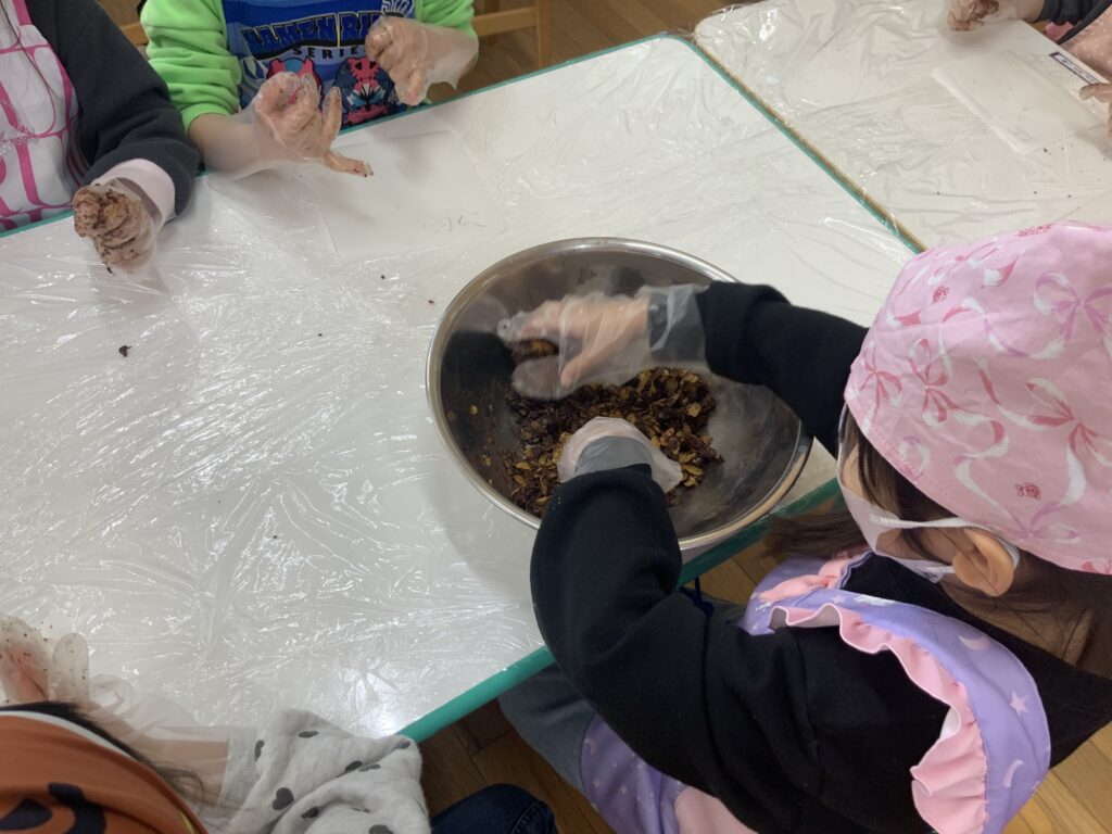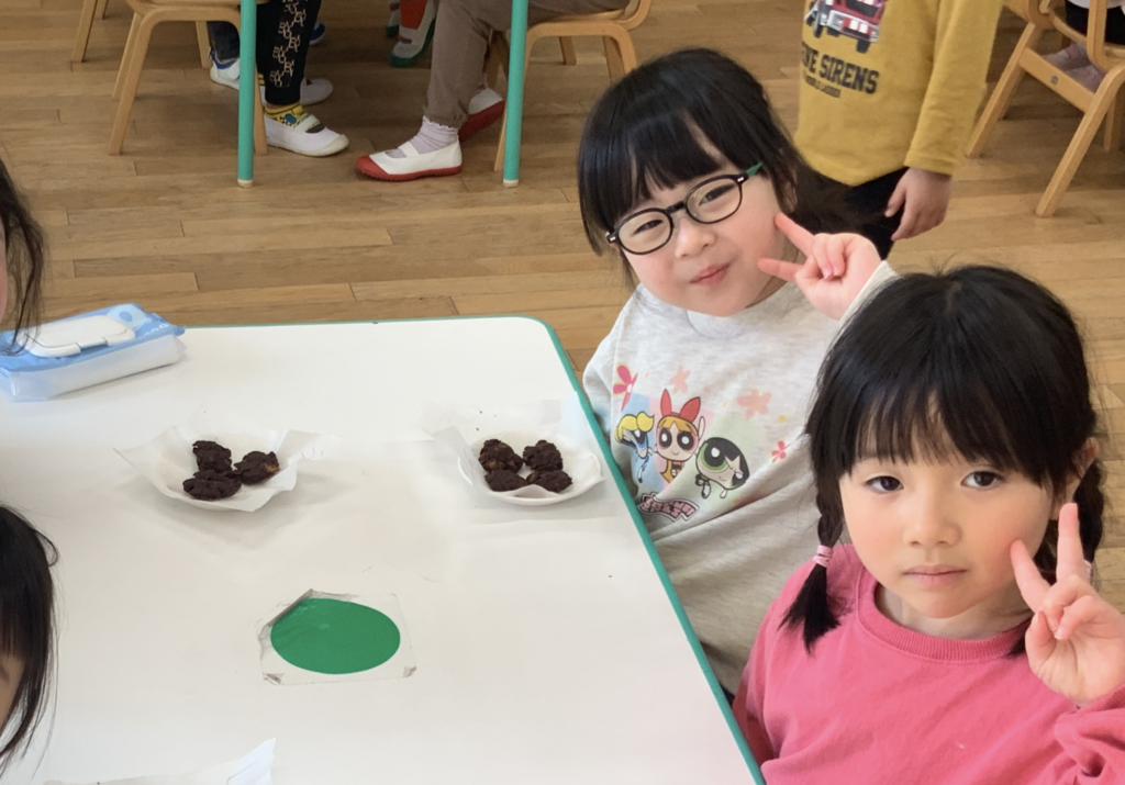 形ができたら、給食室で焼いてもらいました。自分で作って焼きあがったクッキーに大喜びの子どもたち☺「おいしいね」、「わたしのこれだよ」などと言いながら美味しそうに食べていました。