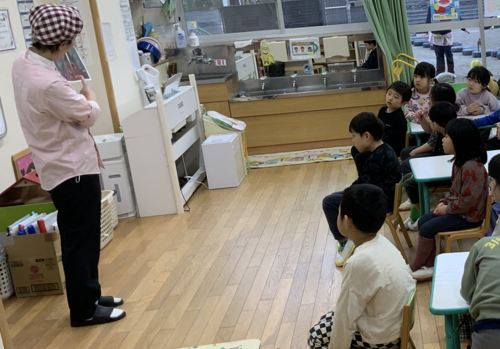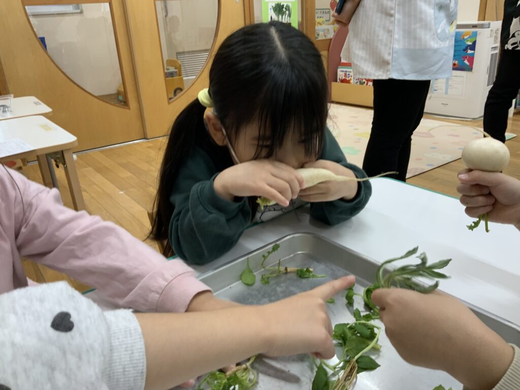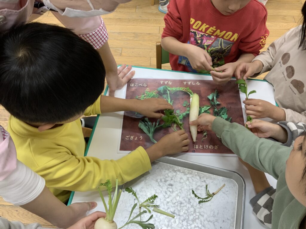 七草 2026-01-07 今日は、七草の食育をしました🥬各クラスに給食の先生が七草を持って来てくれて、説明を聞いた後、みんなで手に取って触ってみたり、匂いを嗅いでみたりしていました。給食には、七草の混ぜごはんが出ます。今日も給食が楽しみな子どもたちです🍚🥢