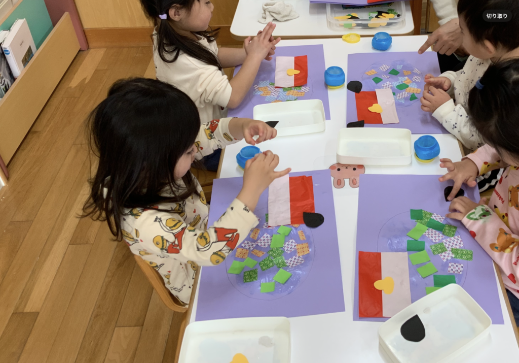 制作したよ 2026-01-27 いつも賑やかな3歳児クラスれもん組🍋 先週、新年子ども会で見た獅子舞の制作をしました。指先を上手に使えるようになり、糊の容器から必要な量の糊を取って、折り紙に付け上手に貼っていました✋お正月遊びを楽しんだり、みんなで子ども会をしたりと楽しい年明けになりました。