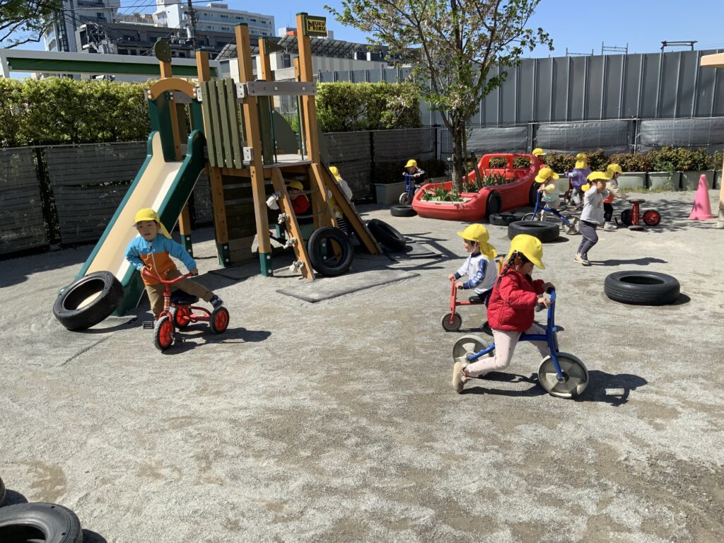 小春日和 2026-04-09 竹の塚北保育園には、広い園庭があって、お天気のいい日はお外遊びを楽しんでいます。桜が咲いて一気に春めき、小春日和の日は、お外遊び日和🌸☼スクーターや三輪車などの乗り物も大人気。上手にこいで乗りこなしています。
