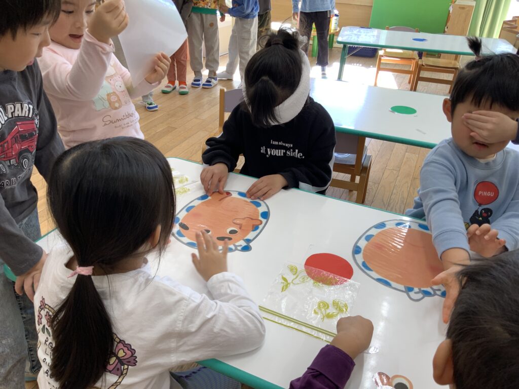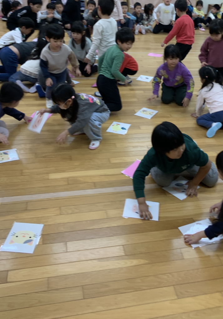 その後に、幼児クラスの子どもたちは、クラスごとに2つの班に分かれてカードめくりを楽しみました。最後に3歳児クラスれもん組🍋4歳児クラスぶどう組🍇5歳児クラスめろん組🍈混合のグループ対抗で行いました。勝ったグループの子どもたちは、万歳しながら大きな歓声を上げ大喜びしていました☺