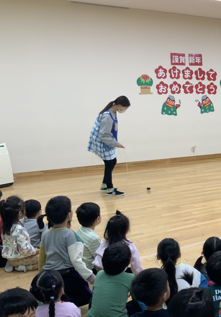 昨日は、0歳児クラスから5歳児クラスのお友だち全員がホールに集まって、新年子ども会を行いました。まずは、みんなで新年のご挨拶をしてから、それぞれが得意な先生が、こま回し、羽子板、けん玉を披露しました。上手くいくと子どもたちから歓声が上がっていました。