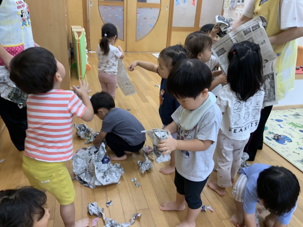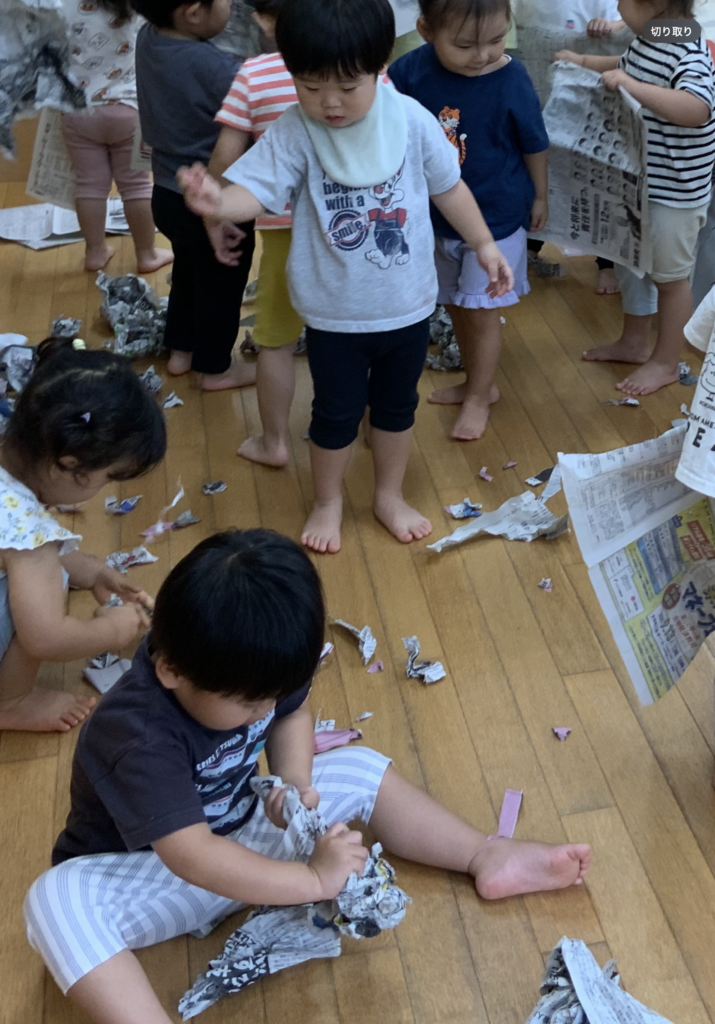 新聞びりびり 2025-10-10 みんな仲良し、元気いっぱい2歳児クラスみかん組🍊 新聞紙で遊んでみました📰まずは先生が新聞をびりびり破ると、子どもたちも一緒に破ったり、丸めたりして楽しんでいました。お部屋の中が新聞紙でいっぱいになるくらいダイナミックに遊び、笑顔満載、楽しそうな声があふれ、大満足していた子どもたちです。 新聞びりびり楽しいな(*^^*)