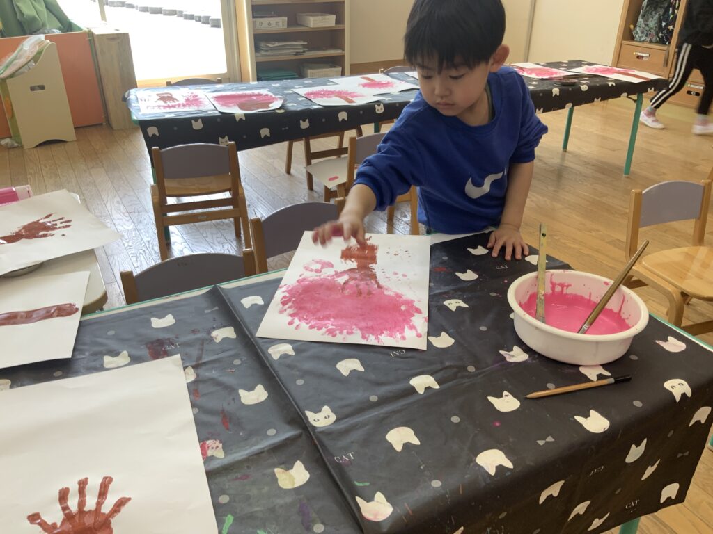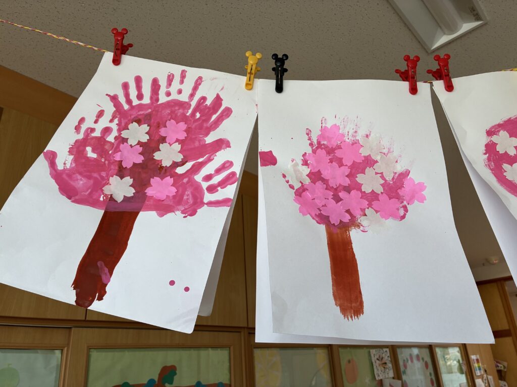 桜咲く 2026-03-24 元気あふれる4歳児クラスぶどう組🍇 手形を押した桜の木の制作をしました。茶色い絵具を手に付けてまずは桜の木を作り、その後にきれいなピンクの絵具を手に付けて画用紙にペタペタ。木に桜の花が咲きました🌸お部屋の中は満開の桜で華やかに彩られています🌸 桜咲く、春ですね🌸🌸🌸