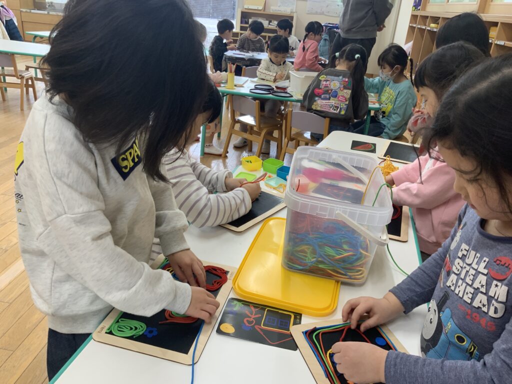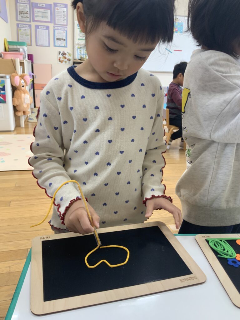 磁石と紐 2026-03-12 いつも元気いっぱい、ニコニコ笑顔の4歳児クラスぶどう組🍇 磁石が付いたプレートに紐をくっつけて形を作るおもちゃを購入し、ぶどう組に渡したところ、早速夢中で遊んでいます。好きな色を選んで思い思いに色んな形を作って楽しんでいる子どもたち。気に入ってくれたようです。