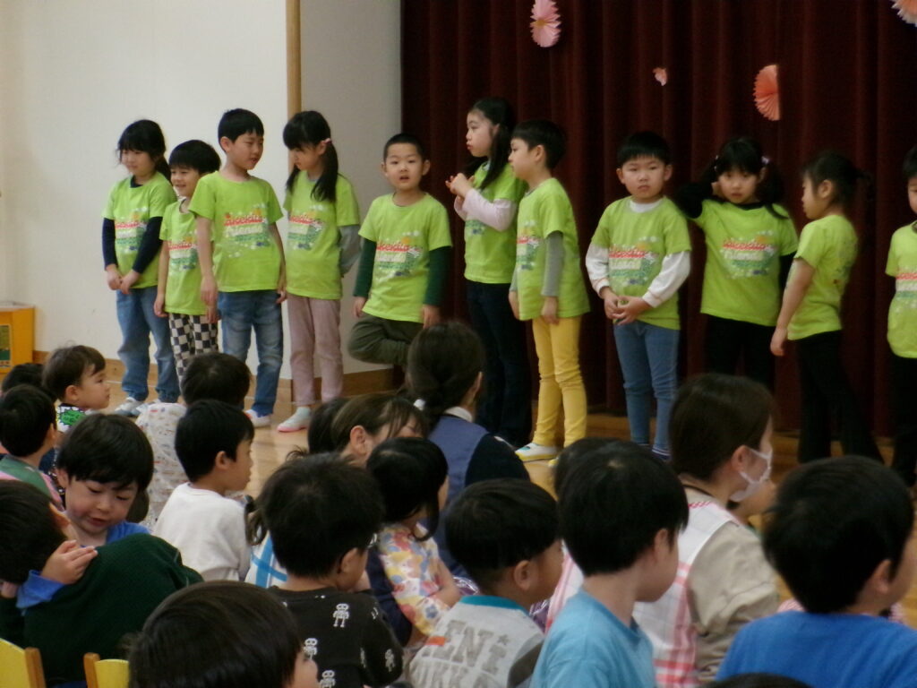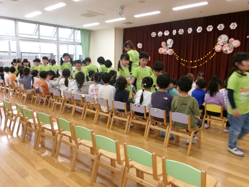 昨日は、0歳児クラスから5歳児クラスまでみんなでホールに集まって進級式をおこないました。