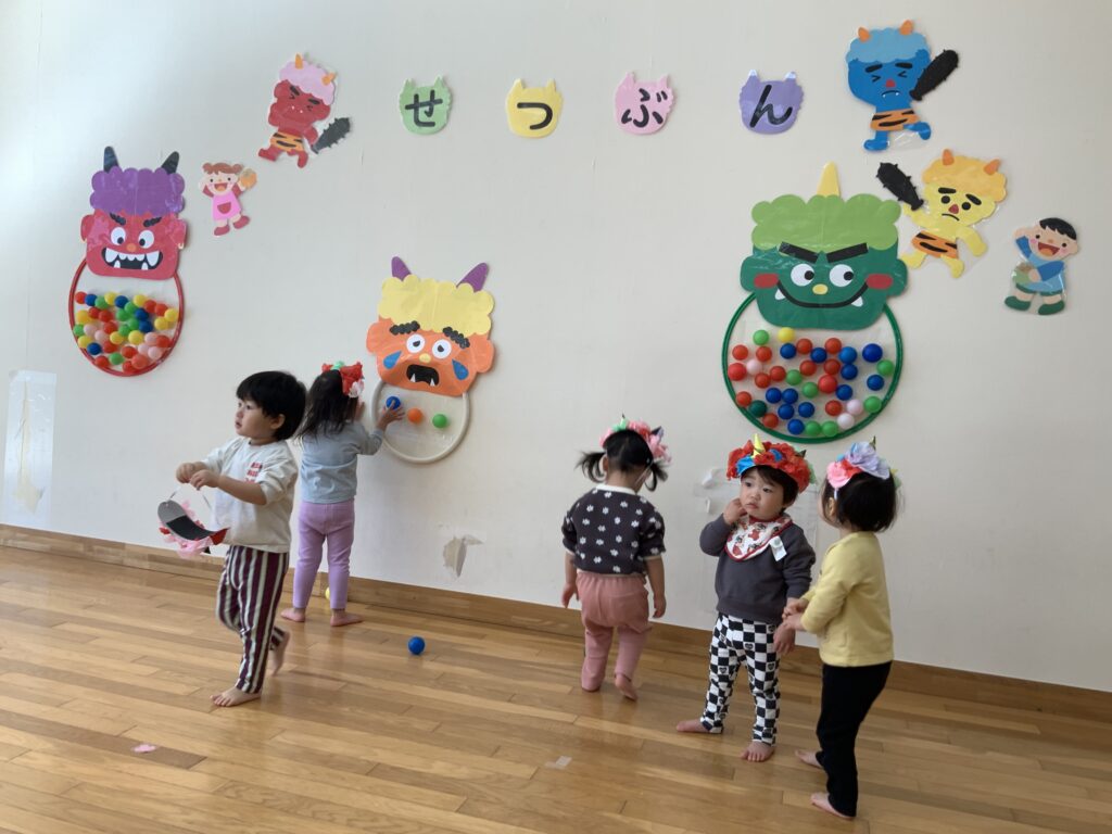 鬼さんにぺったんこ 2026-02-04 1歳児クラスいちご組🍓お話がますます上手になってきました。 昨日は、0歳児クラスさくらんぼ組🍒と一緒に節分をしました☺お歌をうたったりした後に、鬼さんのお顔にボールをくっつけるゲームを楽しみました。ホールに広がったボールを小さな手で一生懸命拾い、お友だちと一緒に鬼さんにぺったんこ✋沢山くっつくと大喜びしていました。頭に付けている可愛いカチューシャは、好きな色のお花紙をクシュクシュして自分で作りました。とても楽しい会になったようでした。