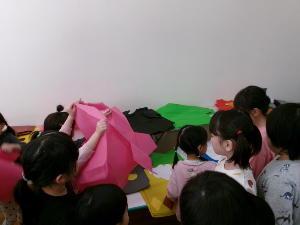 今日は、幼児クラスの子どもたちが異年齢交流として「わくわくランド」を開催しました。内容は、不織布でできた衣装に、先生たちが用意したパーツを自分で付けて自分好みの衣装を作り、着て、ファッションショーをするというイベントです。まずはホールで好きな色の衣装を選びました、その後、れもん組、ぶどう組、めろん組のお部屋に用意してある、リボン、キララのハートやまるなどのシール、ひらひらの飾りから好きな物を選んで付けると素敵な衣装が完成✨✨✨完成してホールに集まると、中心にランウェイができていました。そこをモデルになりみんなが歩いてみました。ポーズをとったり、ピースをしながらかっこいい、可愛いモデルになり写真を撮ってもらいとても嬉しそうな子どもたちでした。最後に、ダンスパーティーをして楽しみました。