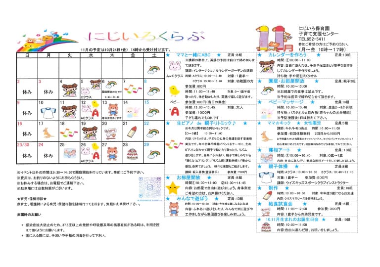 園庭解放・体操教室、育児相談や情報交換、製作等も行います。お気軽にご参加ください。