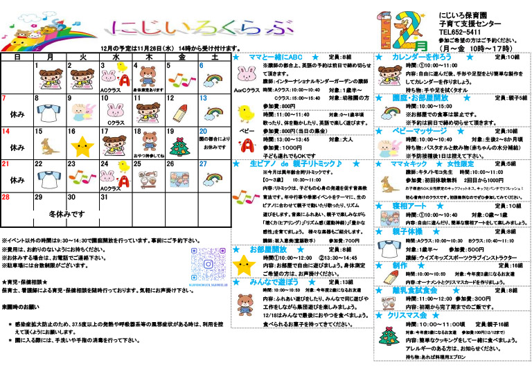 園庭解放・体操教室、育児相談や情報交換、製作等も行います。お気軽にご参加ください。