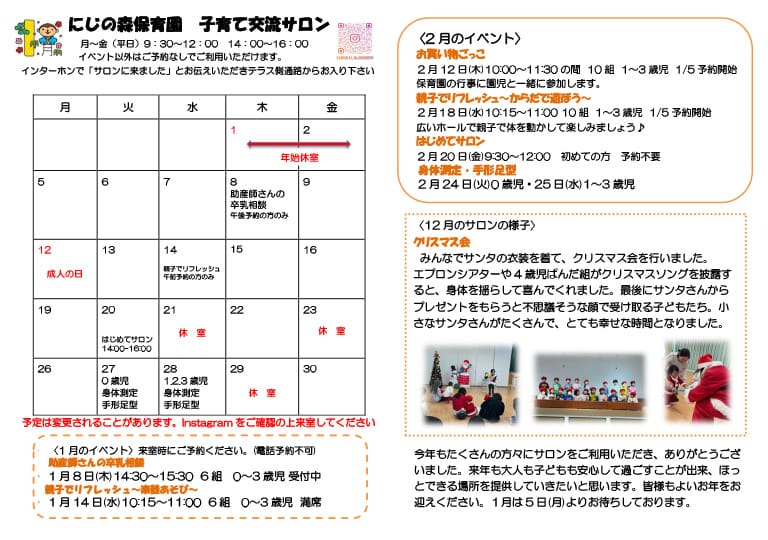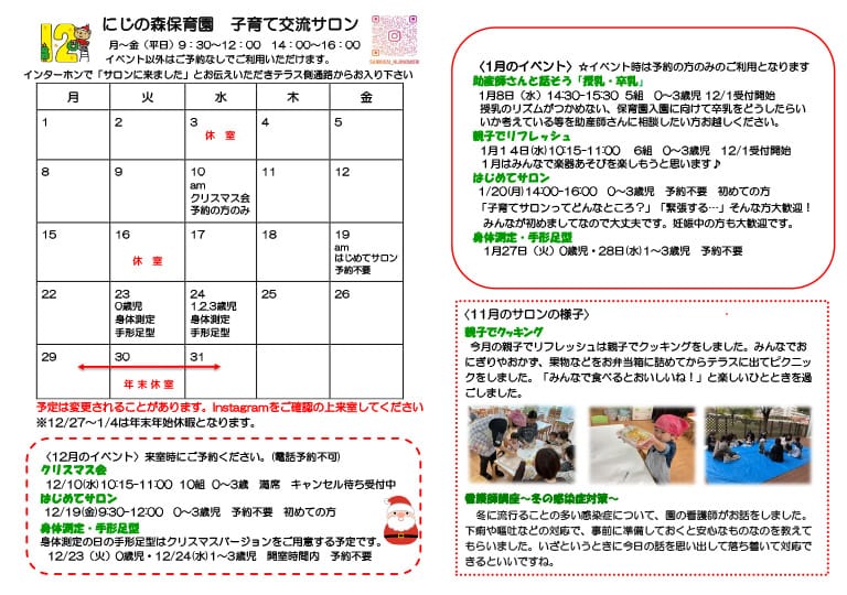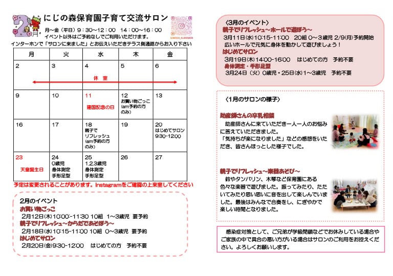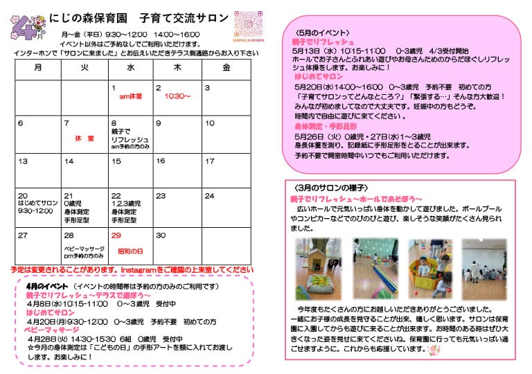 毎月の予定は以下の予定表、またはにじの森保育園のインスタグラムをご覧ください。