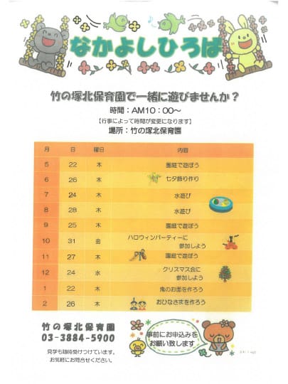 竹の塚北保育園では、なかよしひろばを開催しております。在宅育児中の親子が楽しく参加できる行事へのお誘いや、遊び場を提供しています。また、園見学や育児・健康・栄養相談ができます。