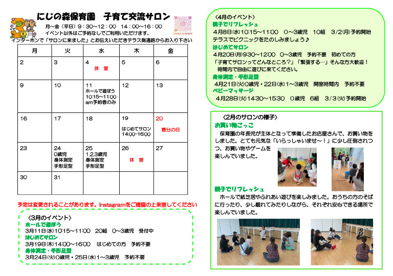 毎月の予定は以下の予定表、またはにじの森保育園のインスタグラムをご覧ください。