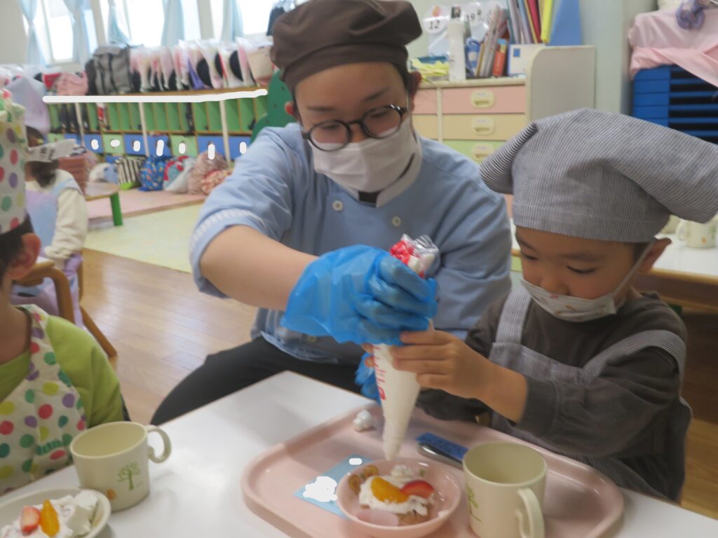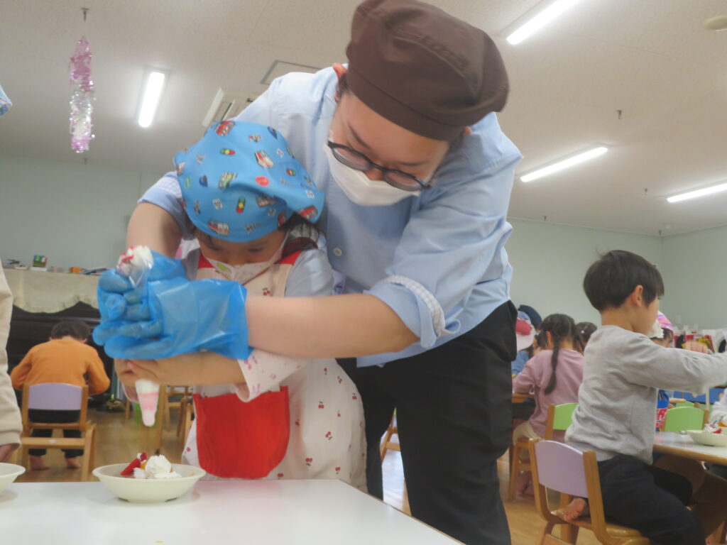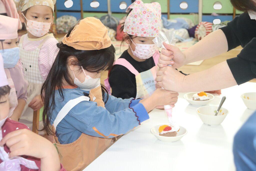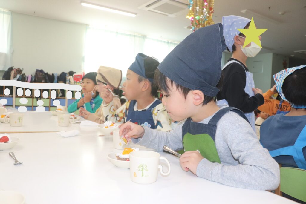 今日の食育活動はクリスマスケーキのデコレーションです。お昼寝から起きるといつもより張り切って身支度をしていた子どもたち。