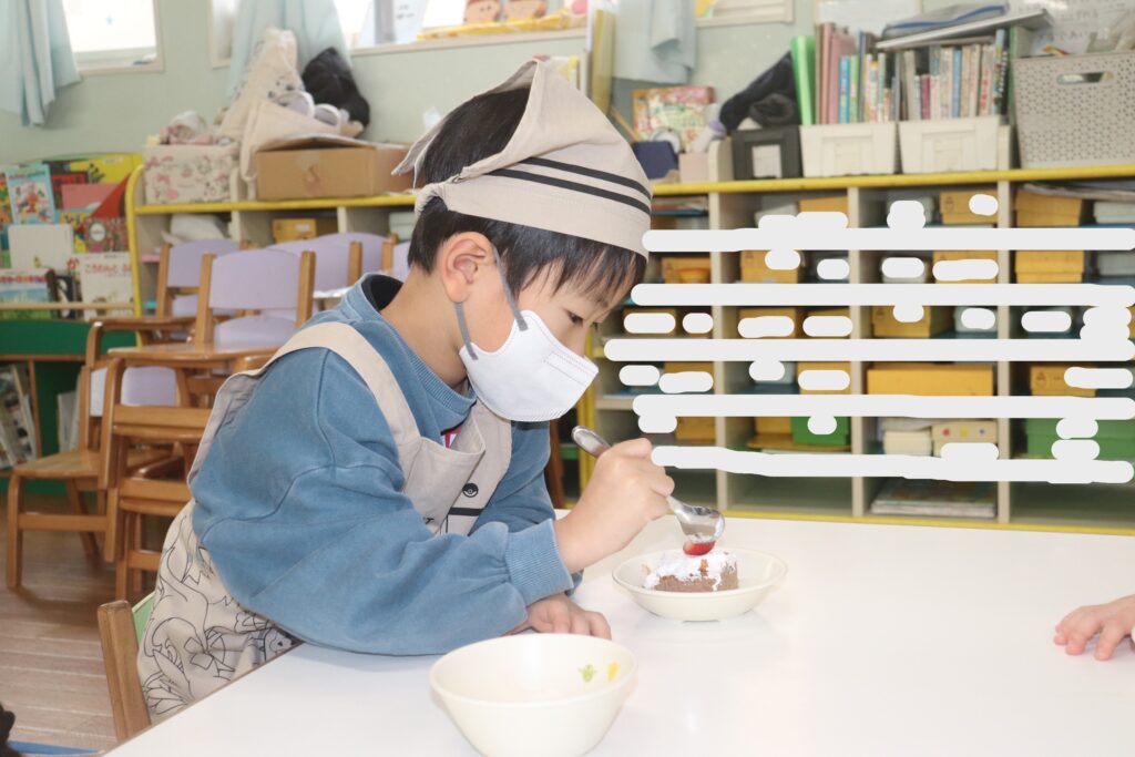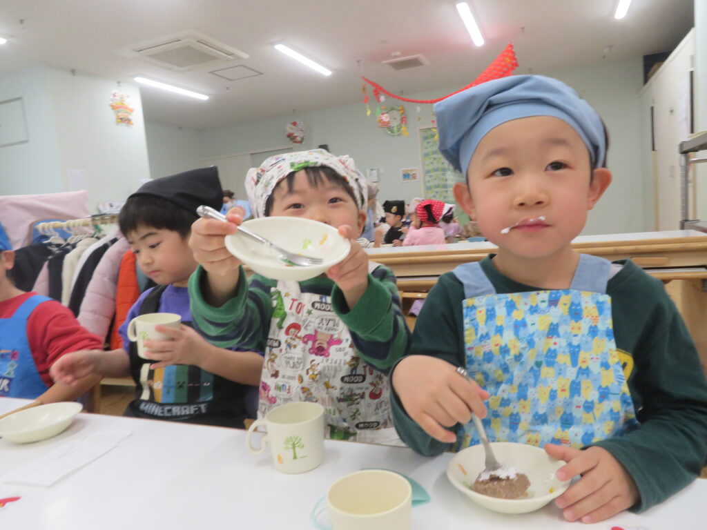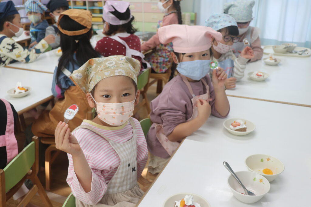 今年最後の食育活動。みんな楽しんでくれたかな。来年も様々な食育活動を行うので、楽しみにしていてくださいね。保護者の皆様、エプロン等の準備、ありがとうございました。