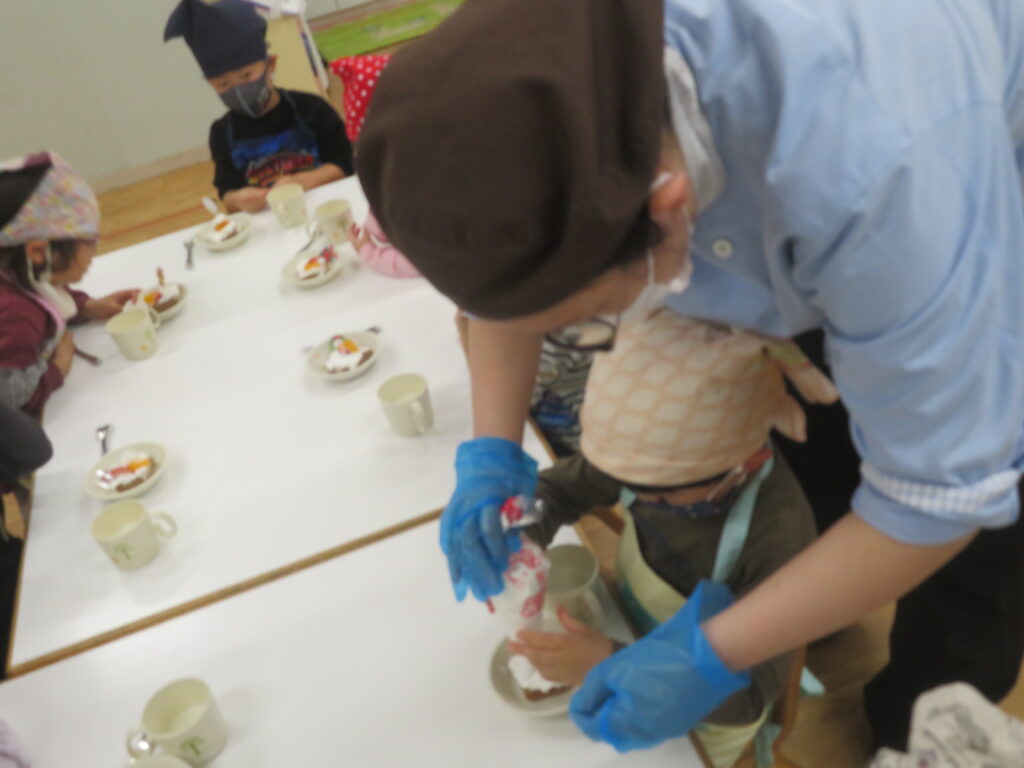 ホイップクリーム絞り。少し力が必要でしたが、コツを掴むと上手に絞れていました。