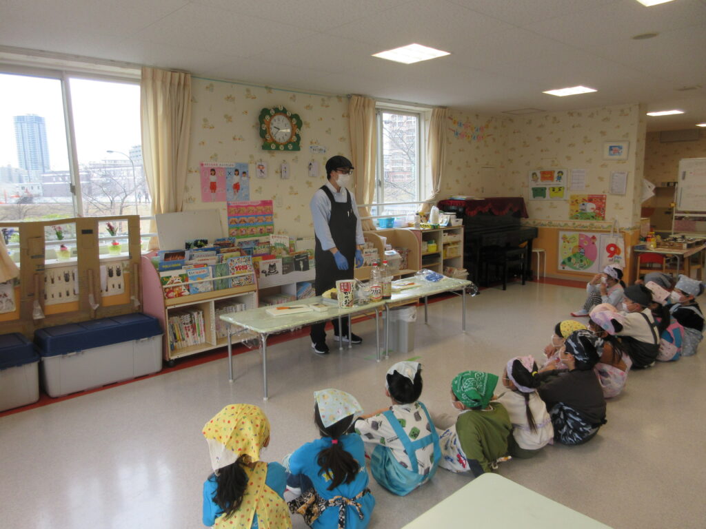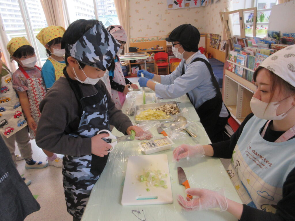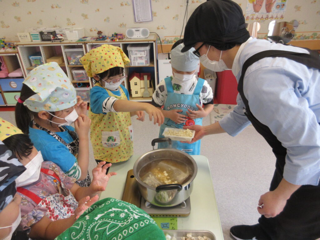 食育 湯豆腐鍋つくり 2026-03-13 寒い時期はお鍋が最高 今回はお鍋に挑戦 栄養士からお話が 野菜切りに挑戦 手元に緊張感が伝わります 出汁を入れていきます お豆腐も入れて お野菜もたっぷり 美味しくなあれ できたお鍋を試食 保育園なので具材は小さくなってますが あったかお鍋できました 「美味しい!」早くみんなにも食べてもらいたいね 心も温かくなった日でした