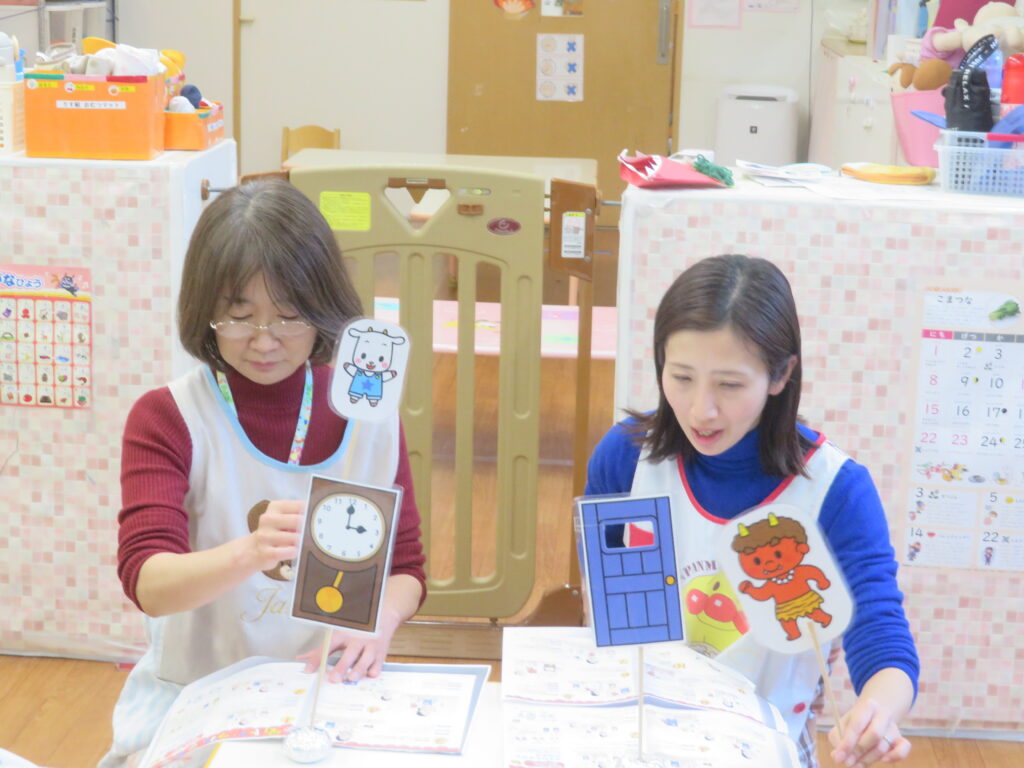 まずは節分に何を飾るのか、紙芝居を見ながら学びました。中にはクリスマスツリーやこいのぼりなどのも出てきて「これは違うよねぇ」なんて声も聞こえましたよ。
